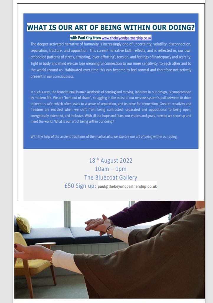 This three hour masterclass will explore how the ancient soft-martial arts can help us explore our inner experiences of self and centre.